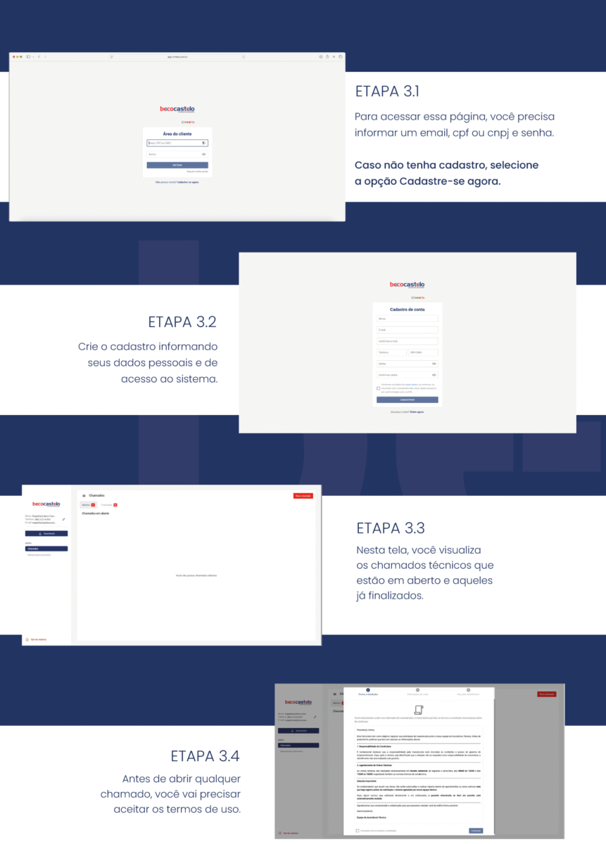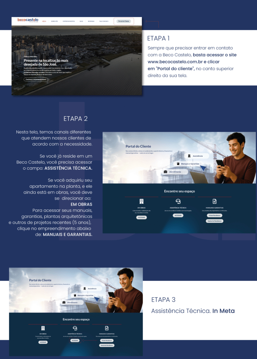 Sempre que precisar entrar em contato com a Beco Castelo, basta acessar o site www.becocastelo.com.br e clicar na opção “Portal do Cliente”, localizada no canto superior direito da tela.